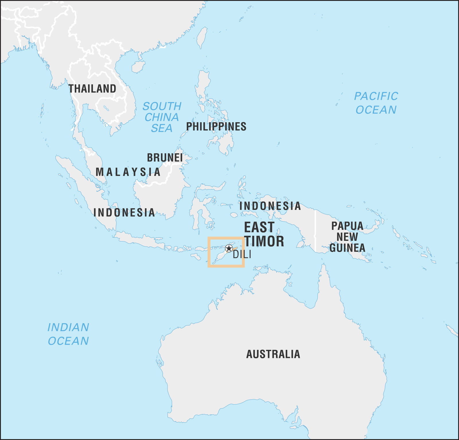 - पूर्वी तिमोर में तिमोर द्वीप का पूर्वी आधा हिस्सा शामिल है, जिसका पश्चिमी आधा हिस्सा इंडोनेशिया का है।