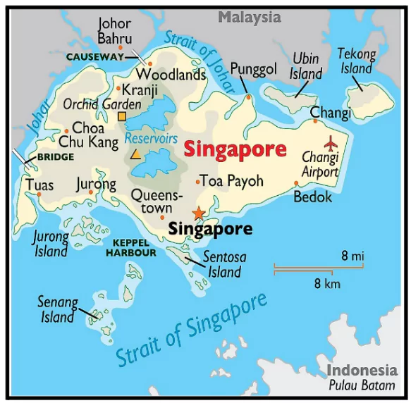 - सीमाएँ: पूर्व में सिंगापुर की सीमा दक्षिण चीन सागर से लगती है और पश्चिम में मलक्का जलडमरूमध्य से लगती है।
